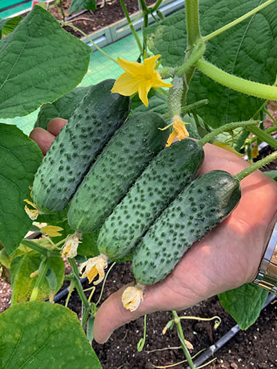- Плоды: Корнишоны, 10-11 см, цилиндрические, крупнобугорчатые, хрустящие, без горечи.