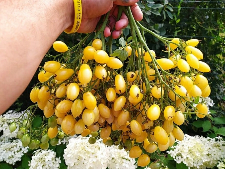 Томат «Сумасшедшие вишни Барри» (Barry’s Crazy Cherry) — раннеспелый, высокоурожайный индетерминантный сорт от селекционера Бреда Гейтса. Славится огромными, веерными кистями (по 50+ плодов) сладких, желто-прозрачных черри с «носиком» (10–30 г). Высокорослый (до 2 м), подходит для теплиц и открытого грунта, требует пасынкования.