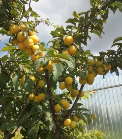 Царская – небольшое дерево, высотой 2,5, иногда 3 метра. Крона компактная, плоскоокруглая, радиусом в 1,5 метра. Со временем может разрастаться. Пятилепестковые душистые цветки белого цвета, в количестве 1 или 2 в соцветии, появляются до распускания листвы. Цветение обильное. Плоды у алычи красивой формы. Одномерные, шаровидные, массой в 18 – 25 грамм. Кожица плотная, не толстая, окрашена в яркий жёлтый цвет и покрыта восковым налётом небольшой интенсивности. Мякоть жёлтая, нежная, сочная, слегка волокнистая. Вкус у сорта, напоминающий одновременно абрикос и дыню, скорее сладкий, с небольшой кислинкой. Косточка маленькая, хорошо отделяется от мякоти.